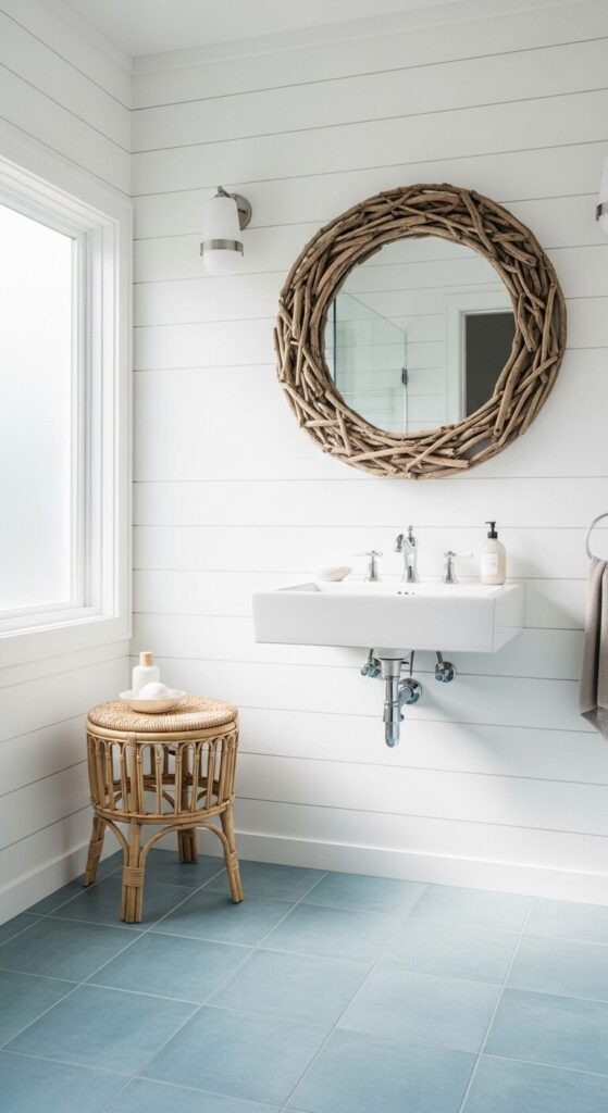 Envision a breezy bathroom with soft blue vinyl tiles evoking ocean waves. White walls and rattan accessories create a serene, beachy escape.