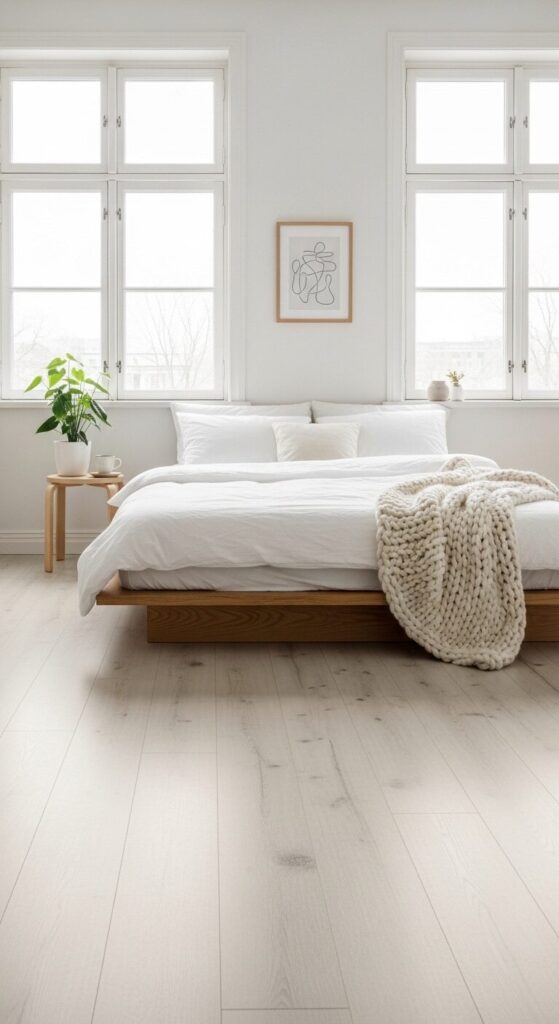 Imagine a minimalist bedroom with light white oak vinyl flooring, glowing under soft natural light. Crisp white bedding and wooden accents create a calm, Nordic vibe.