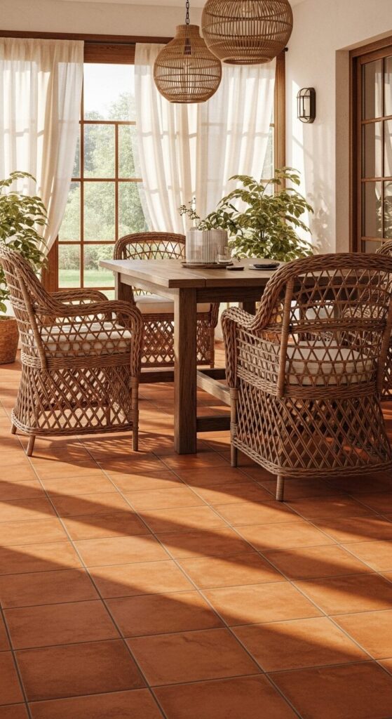 Picture a sun-drenched patio room with terracotta-look vinyl tiles in rich, earthy reds. Woven chairs and potted cacti create a Mediterranean oasis.