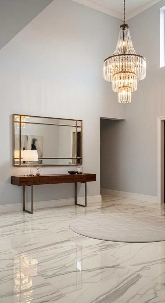 Picture an elegant entryway with creamy marble-look vinyl flooring, reflecting soft light from a crystal chandelier. Gold accents and a console table add luxury.