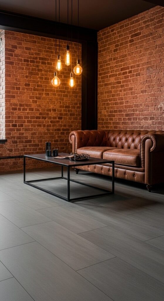 Envision a modern loft with cool gray concrete-look vinyl flooring, paired with exposed brick walls and black metal furniture. The vibe is urban and edgy.