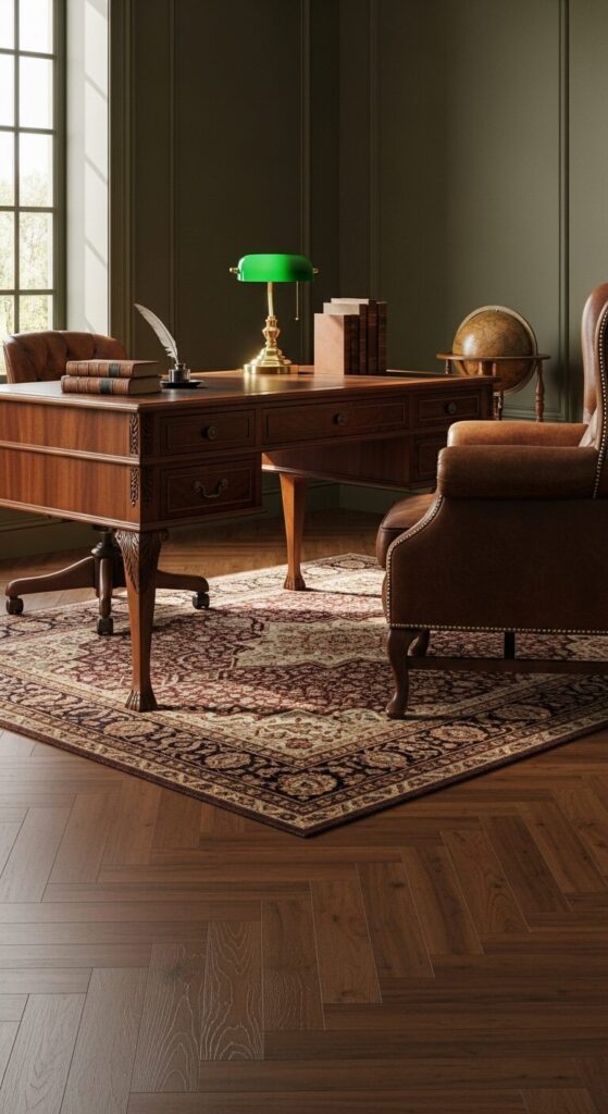Imagine a timeless study with rich walnut parquet vinyl flooring, paired with leather armchairs and a mahogany desk. The vibe is warm and scholarly.