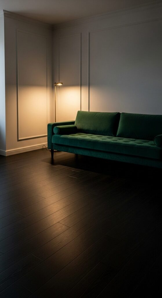 Picture a moody living room with deep ebony vinyl planks, contrasted by ivory walls and plush velvet furniture. The vibe is dramatic yet cozy.