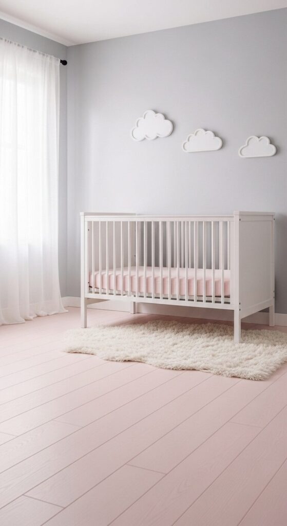 Choose pastel vinyl planks for a gentle, calming effect. Pair with soft textiles and neutral accents to keep it airy.