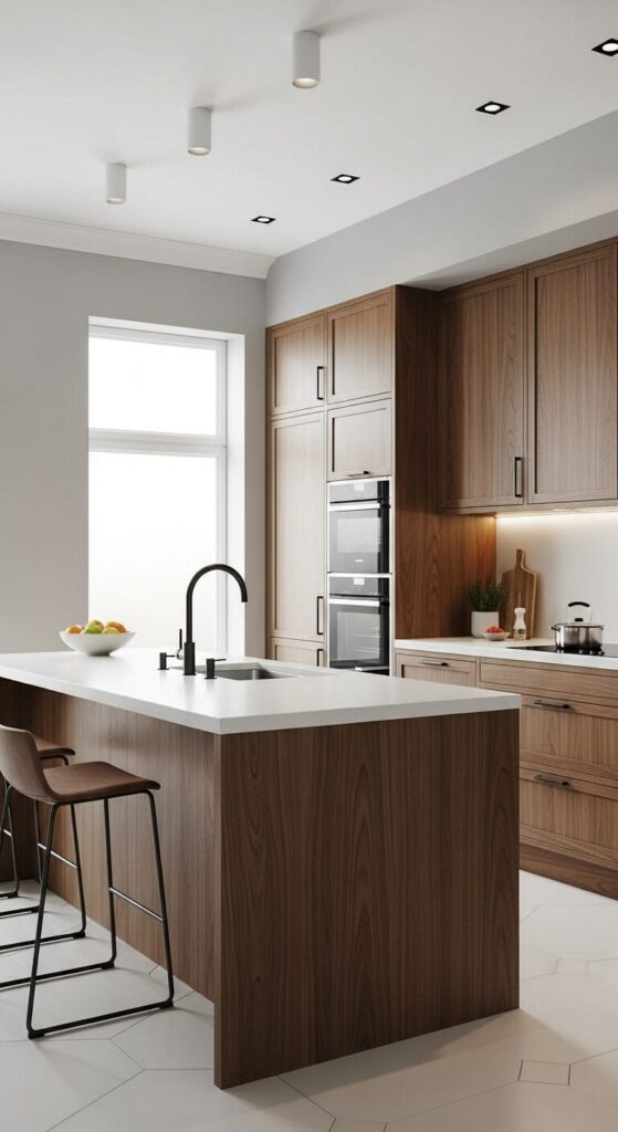 Gaze at a sleek kitchen where walnut cabinets blend seamlessly into modern lines.
