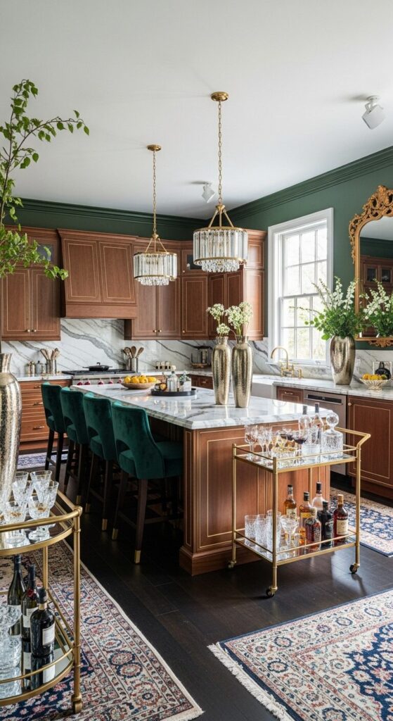 Indulge in a glamorous kitchen where walnut cabinets shine with golden highlights.