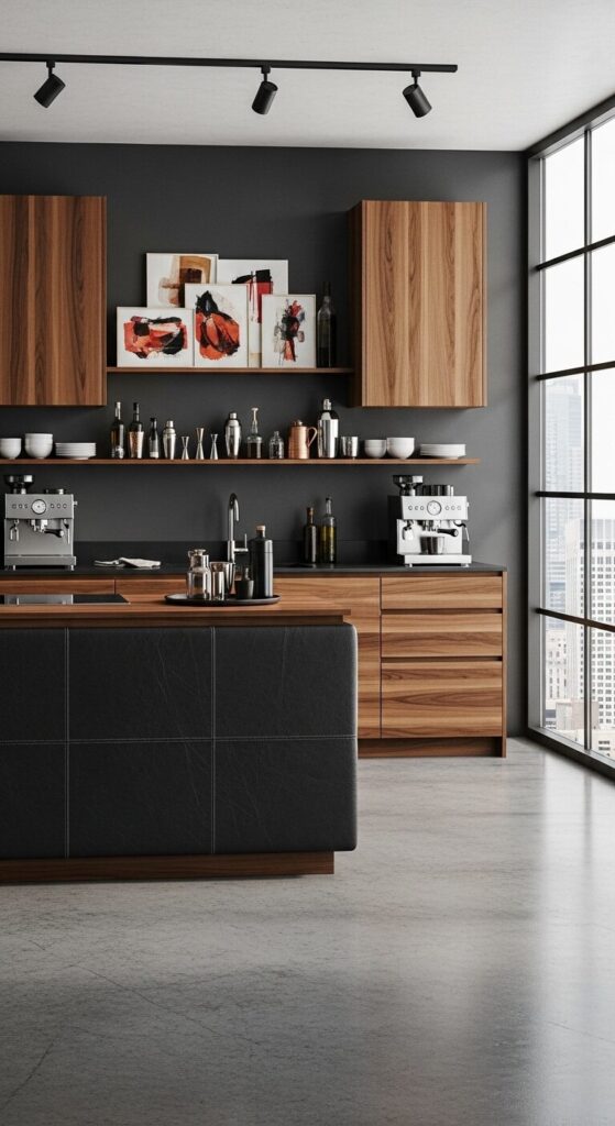 Dive into a cosmopolitan kitchen spotlighting walnut cabinets with urban edge.