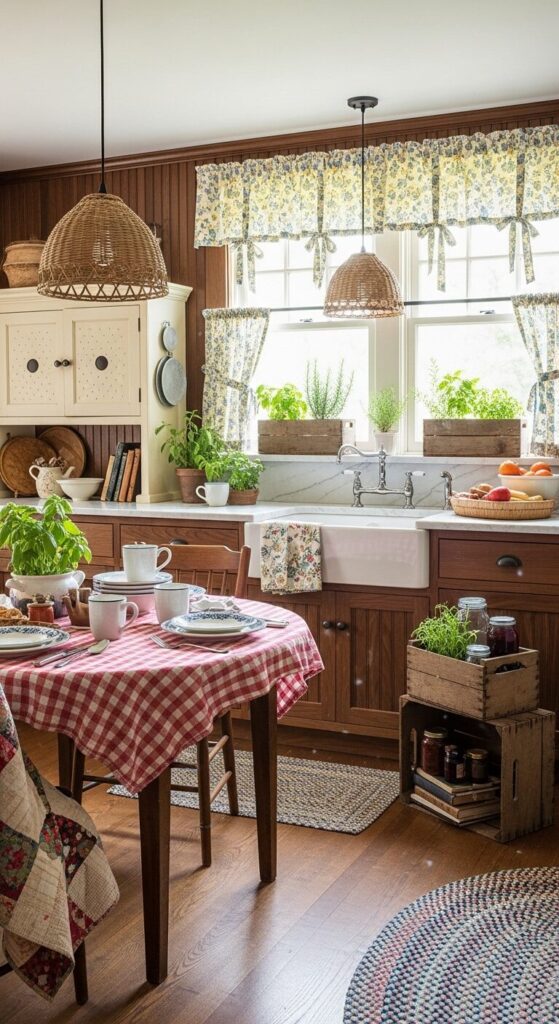 Add gingham fabrics, cast-iron pans, and wicker baskets overflowing with apples.