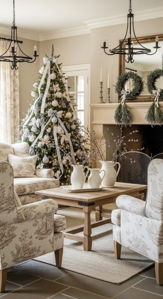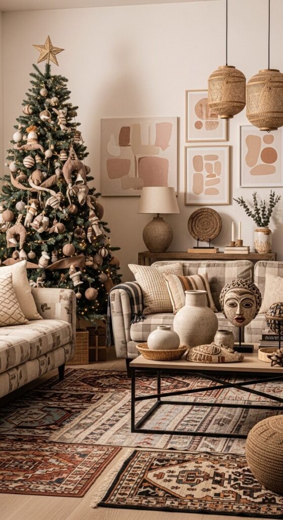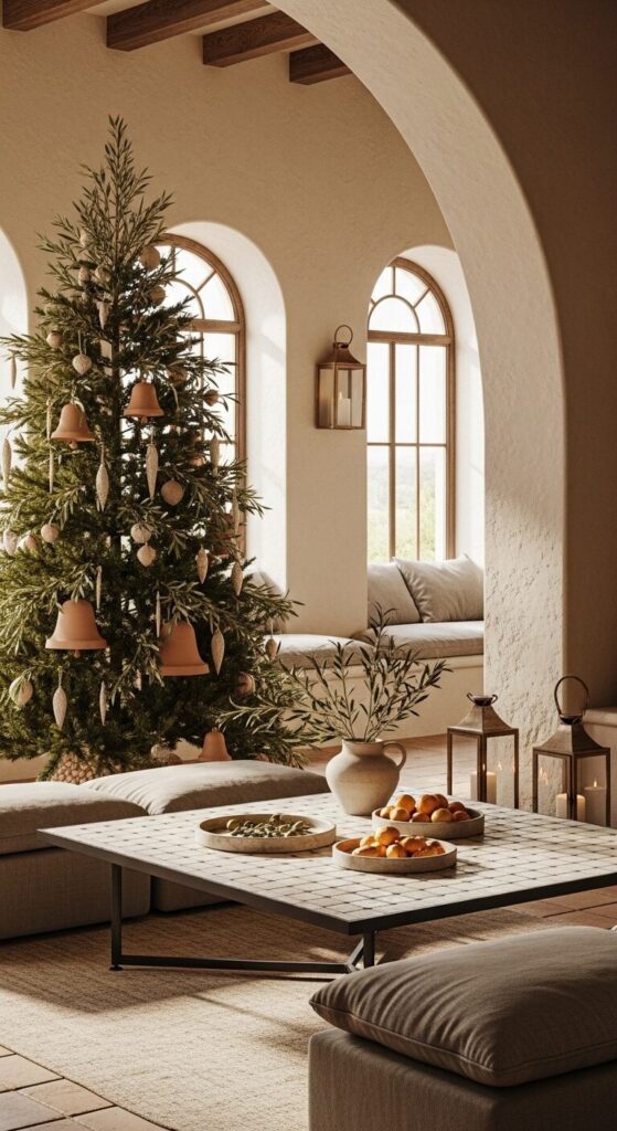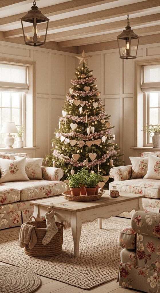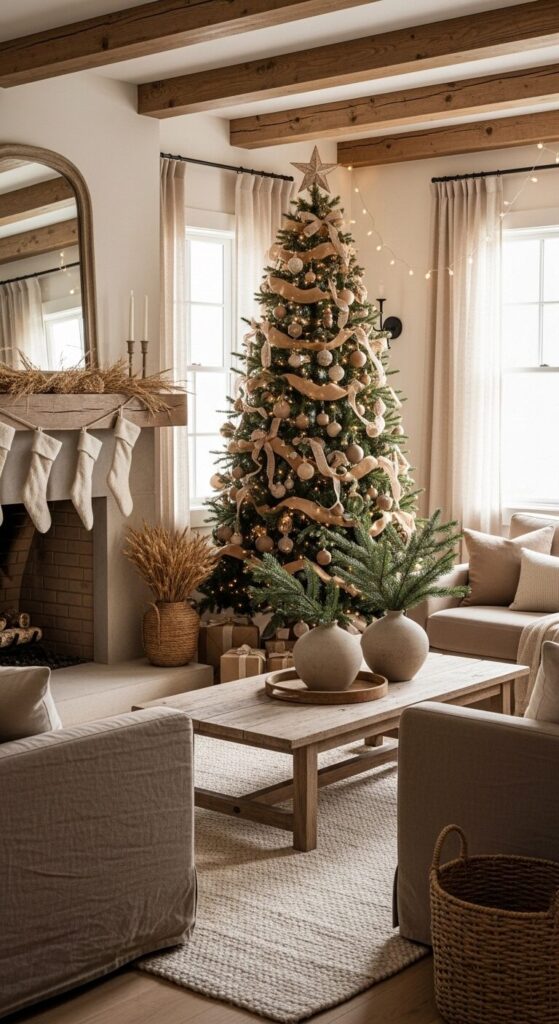 Picture a sun-dappled room where wooden beams overhead meet creamy plaster walls, setting a grounded stage for holiday magic.