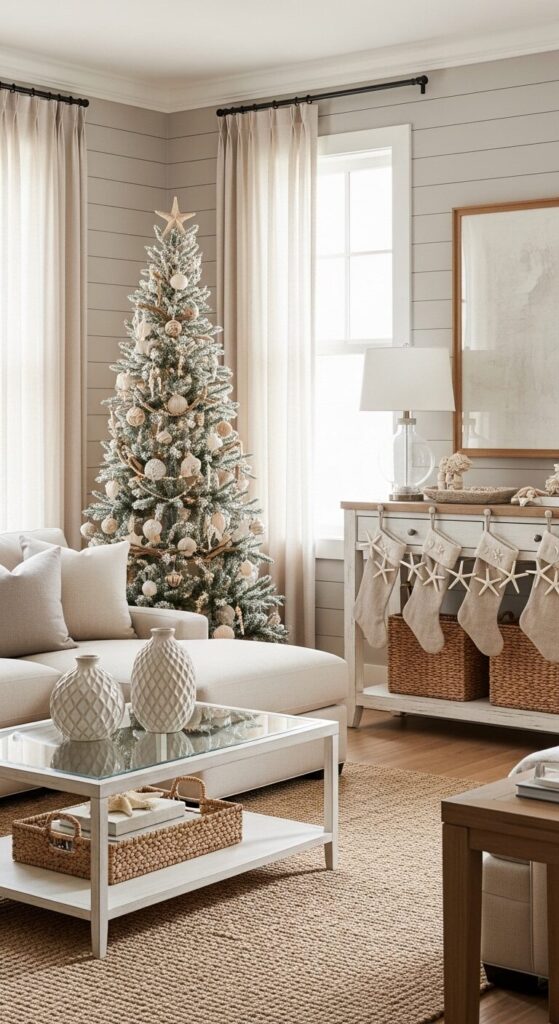 See a breezy room with shiplap walls in soft driftwood gray, framing windows that let in whispers of ocean air during the holidays.