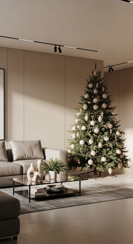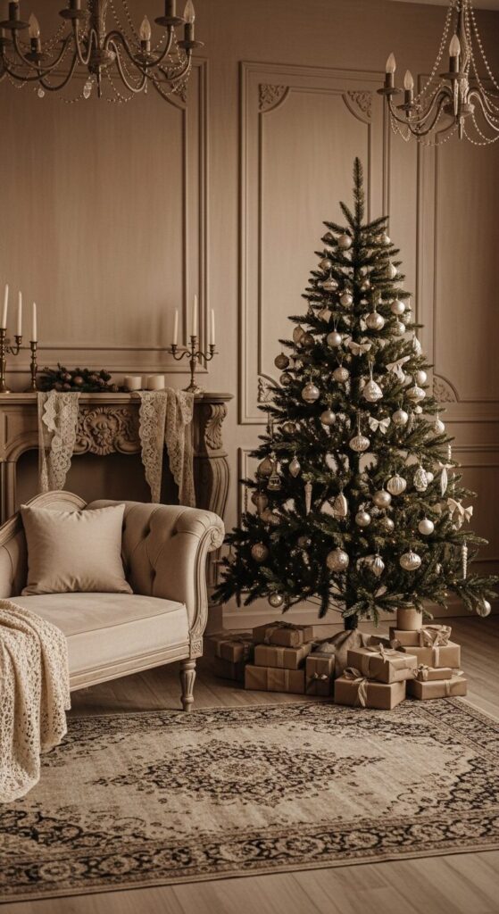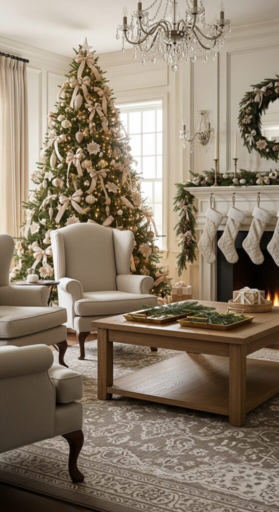 Imagine soft beige walls catching the flicker of fairy lights, plush cream throws draped over earthy taupe sofas, and a Christmas tree sparkling with subtle gold and ivory ornaments—it’s the perfect blend of understated elegance and festive cheer.