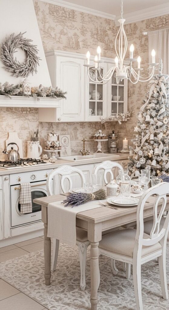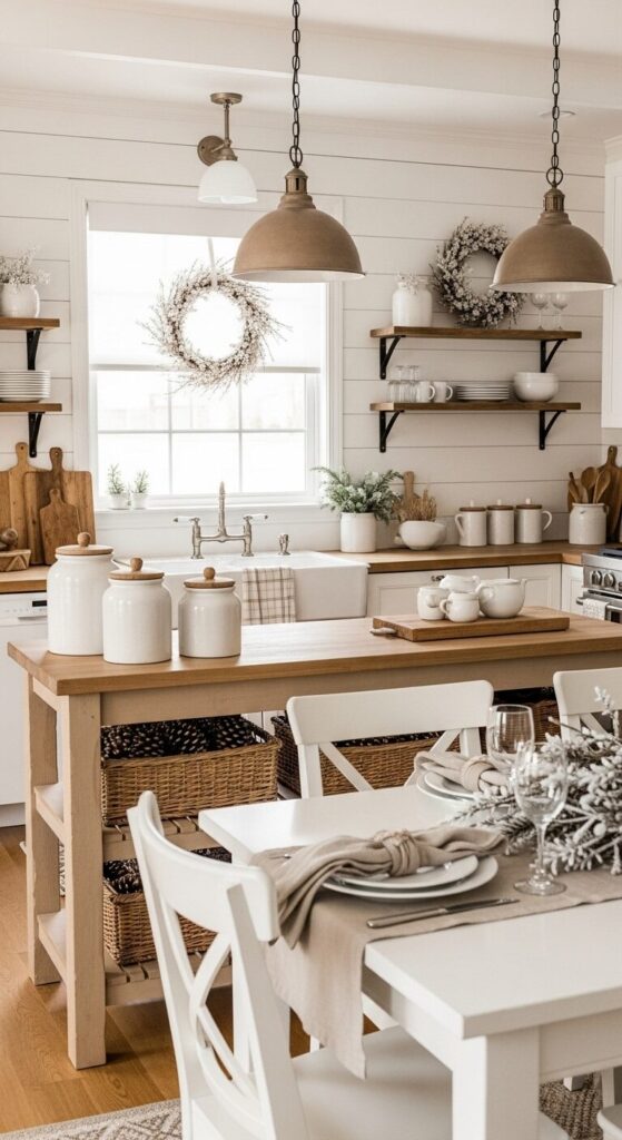 2. Rustic Farmhouse White and Beige Christmas Kitchen