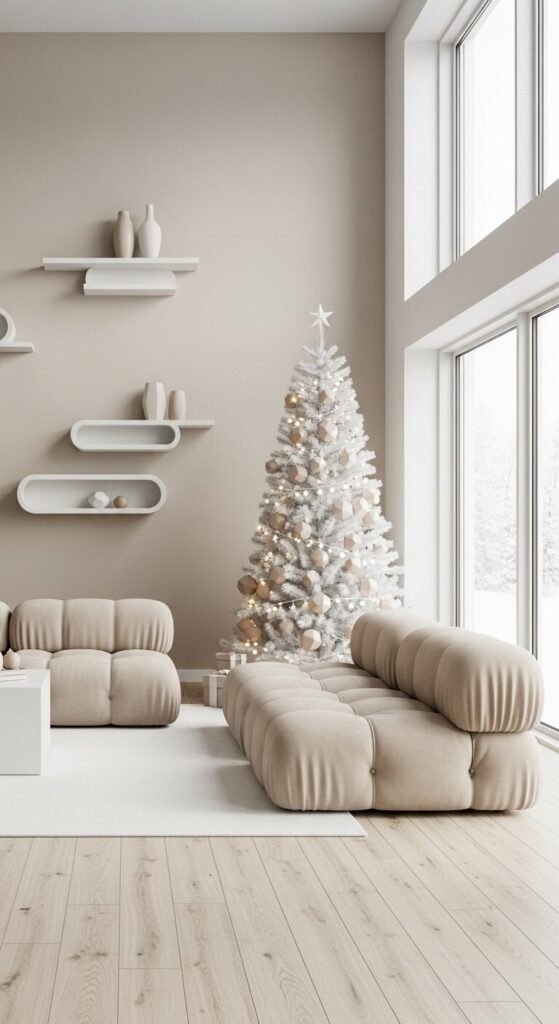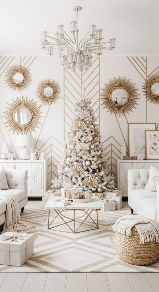 15. Art Deco Inspired White and Beige Christmas Living Room