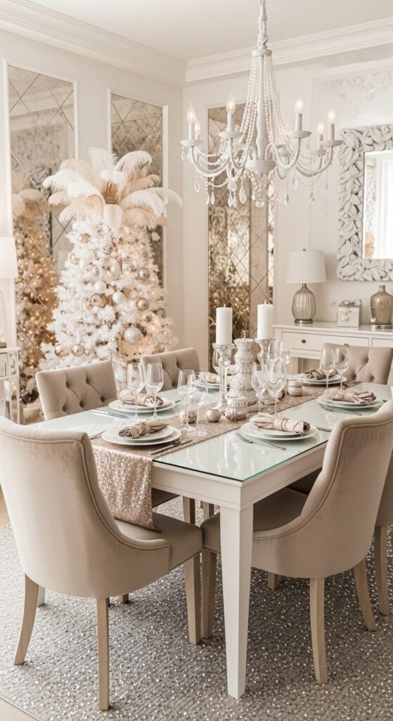 12. Glamorous Glow White and Beige Christmas Dining Room