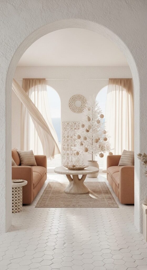 14. Mediterranean Breeze White and Beige Christmas Family Room