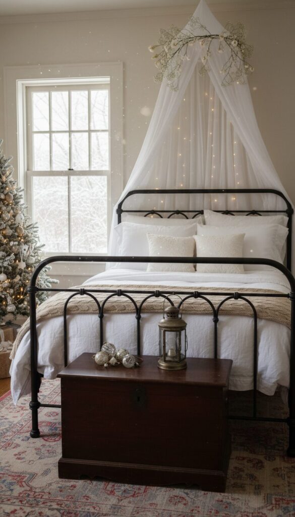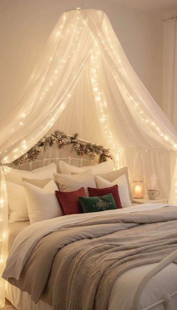 Transform a canopy bed into a magical festive retreat using sheer white fabric and delicate fairy lights. Drape soft, sheer white fabric over the canopy frame, creating a ethereal, tent-like feel.