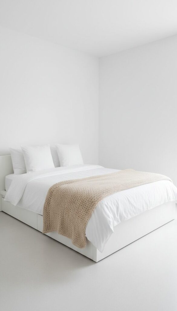 Achieve a striking and serene look by keeping most of the bedroom purely white, then introducing a single, impactful beige element. Imagine an all-white bed – white sheets, duvet, and pillows – against a white wall.