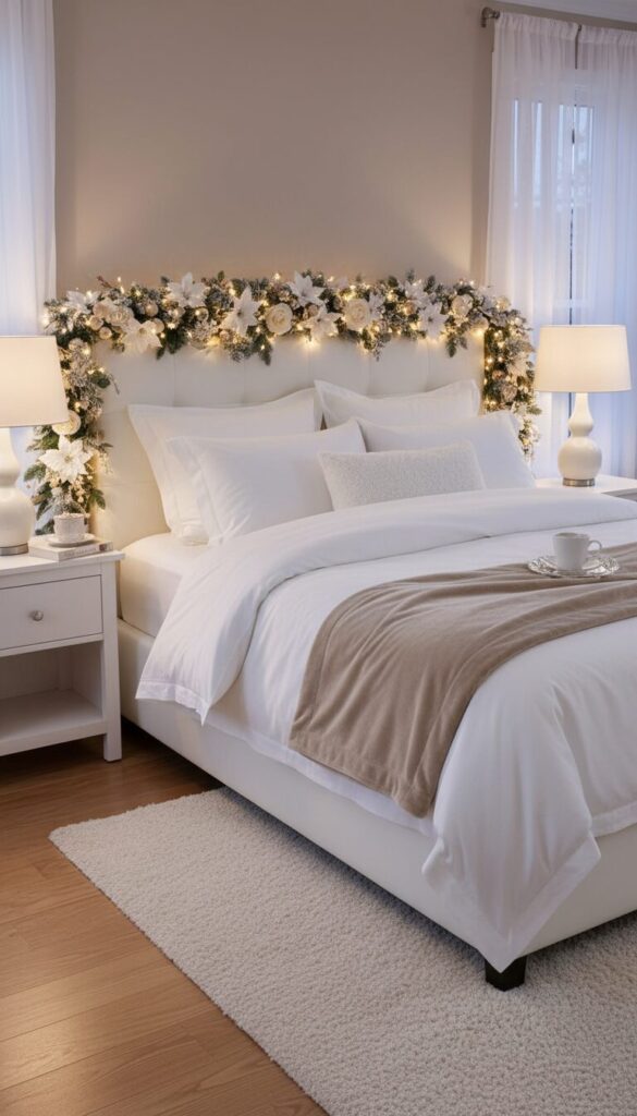 Frame your sleeping space with an exquisite display of white and beige festive elements. A lush faux white and beige garland, possibly with subtle silver or gold glitter, gracefully drapes around the headboard or over the window.