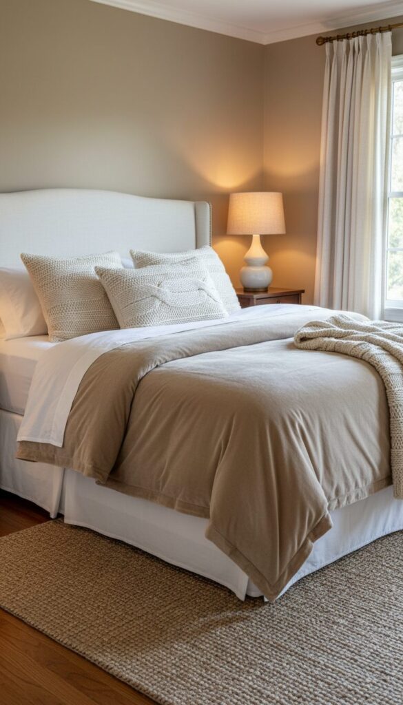 This subtle variation creates sophisticated depth that prevents your bedroom from looking washed-out or sterile, especially important in monochromatic neutral schemes.