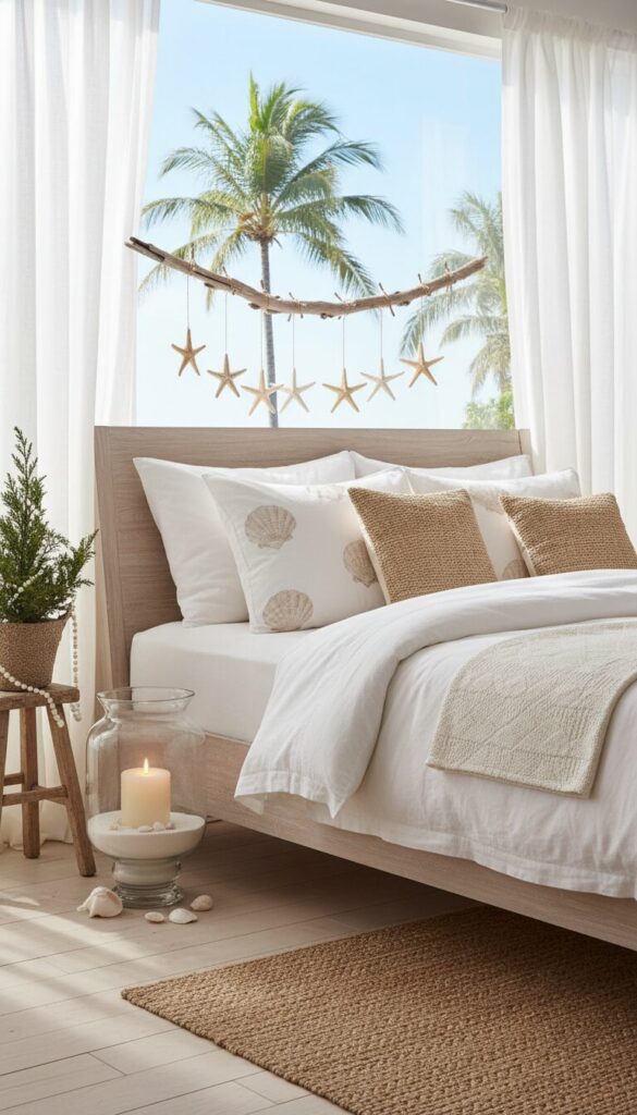 A hurricane lantern filled with white sand and pillar candles adds a warm, beachy glow, creating a serene holiday escape.