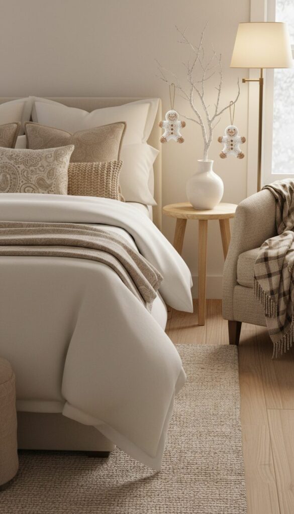 Think creamy white bedding accented by beige and light brown throw pillows, perhaps with a subtle pattern reminiscent of gingerbread cookies.