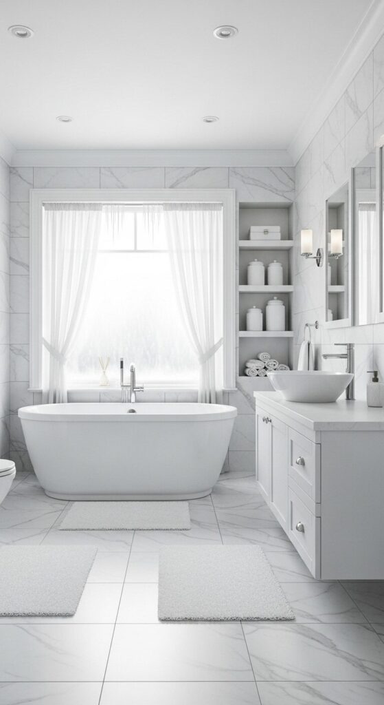 Picture a bathroom bathed in pure white, evoking the calm of a fresh snowfall blanketing the world outside.