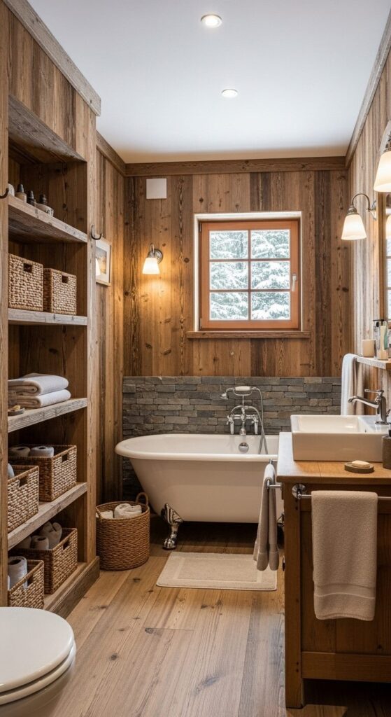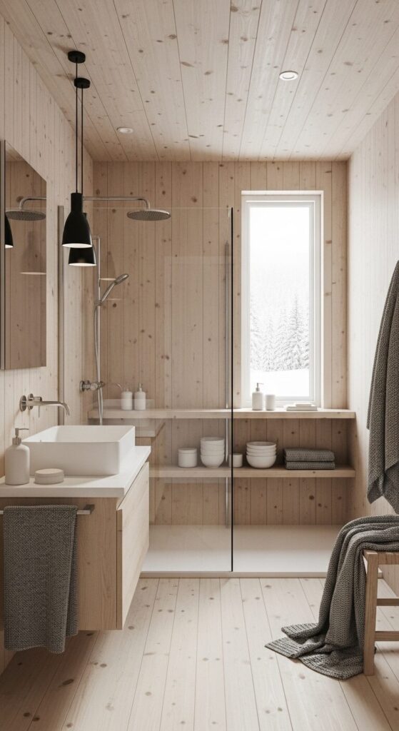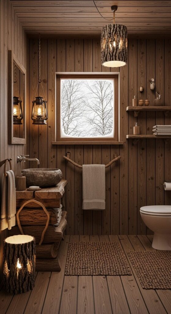 Step into a bathroom that feels like a hidden cabin in the woods, where every surface whispers of winter’s quiet embrace.