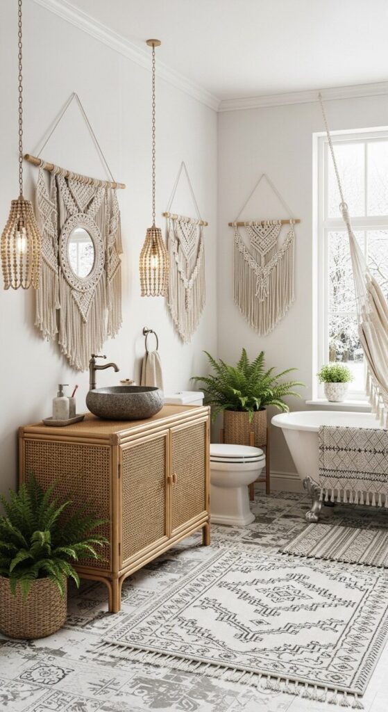 Wander into a bathroom alive with boho flair, where layered textiles mimic a snowy nomadic tent.