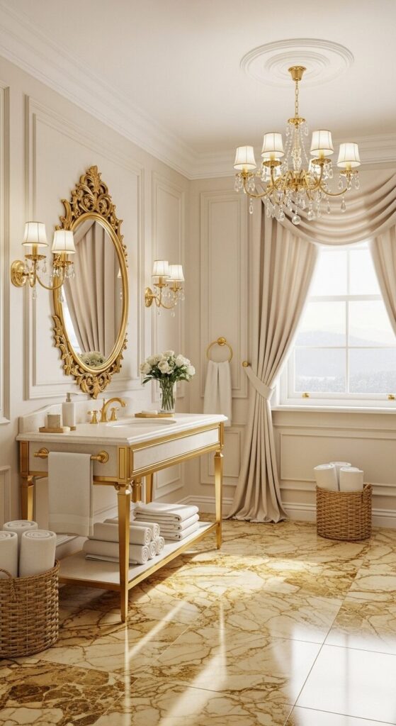 Polished gold faucets grace creamy quartz surfaces, complemented by embroidered linens in soft ivory.