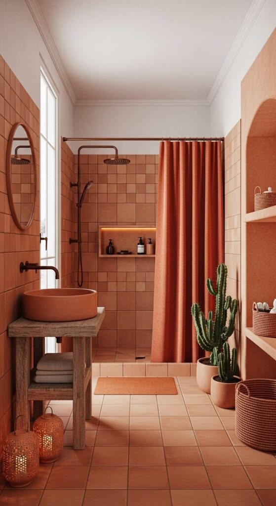 Sink into a bathroom glowing with terracotta earthiness, evoking sun-baked clays under winter skies.