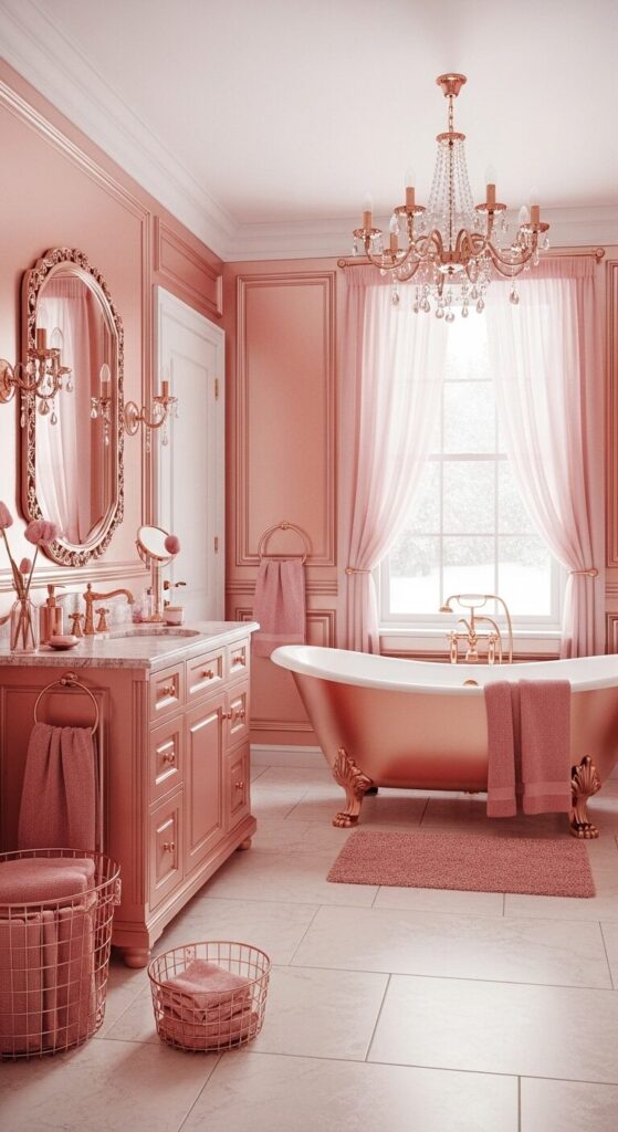 Drift into a bathroom blushing with rose gold, like a tender sunset fading into winter night.