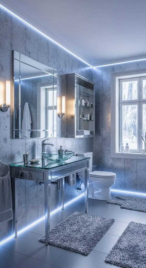 Gaze upon a bathroom shimmering in silver, capturing the crisp gleam of winter frost on metal.