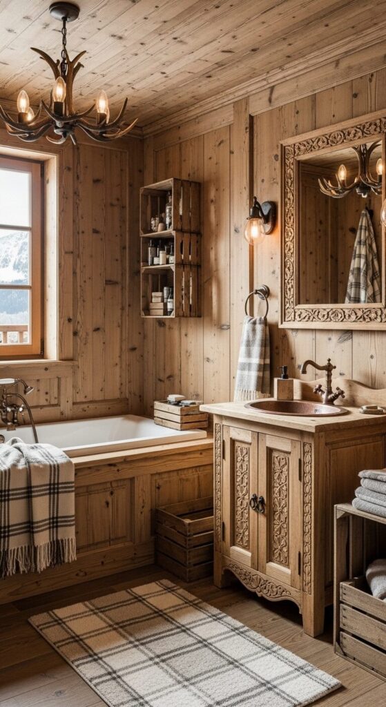 Ascend to a bathroom crafted from alpine woods, like a chalet perched on snowy peaks.