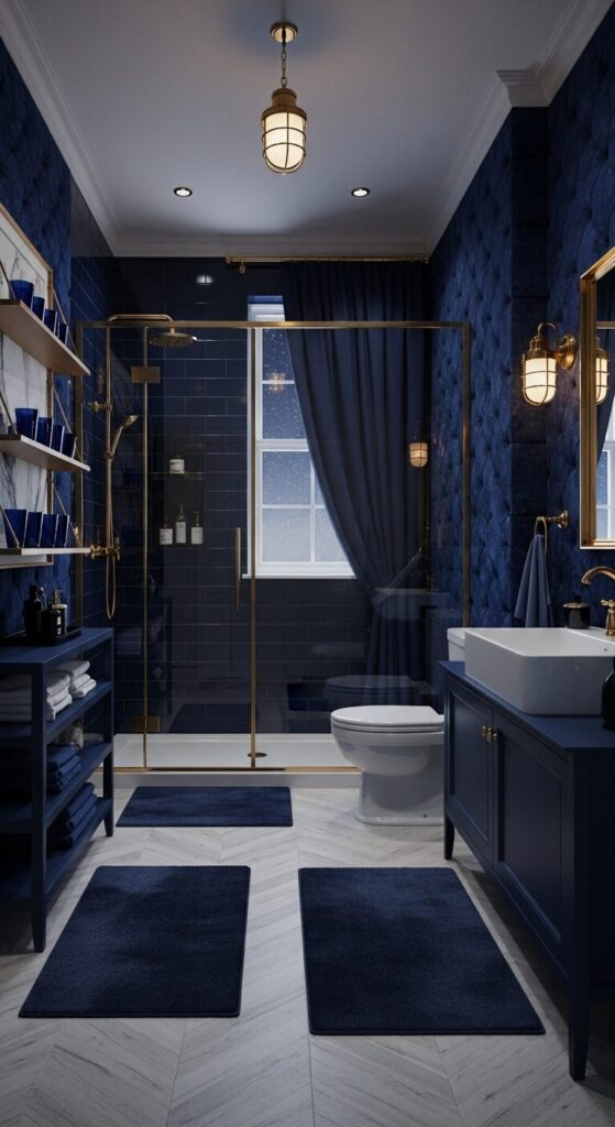 Plunge into a bathroom of profound navy, like a velvet cove under midnight winter skies.