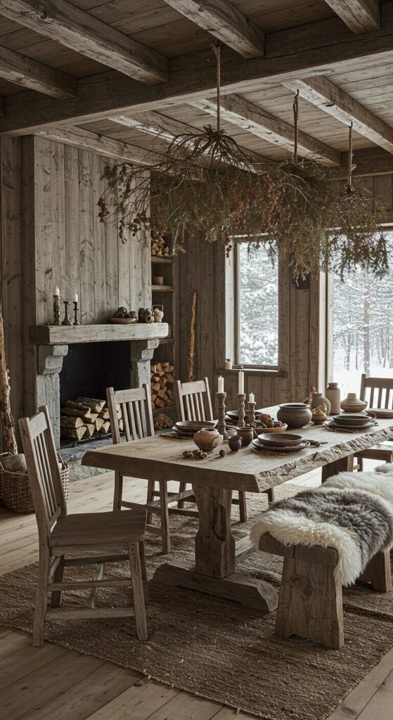 Picture a dining room where snow-dusted pines peek through frosted windows, framing a sturdy oak table that anchors the space like an old forest hearth.