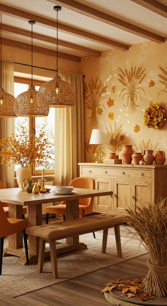 Imagine a room where golden sunlight filters through amber curtains, casting a harvest-like warmth over a maple dining set.