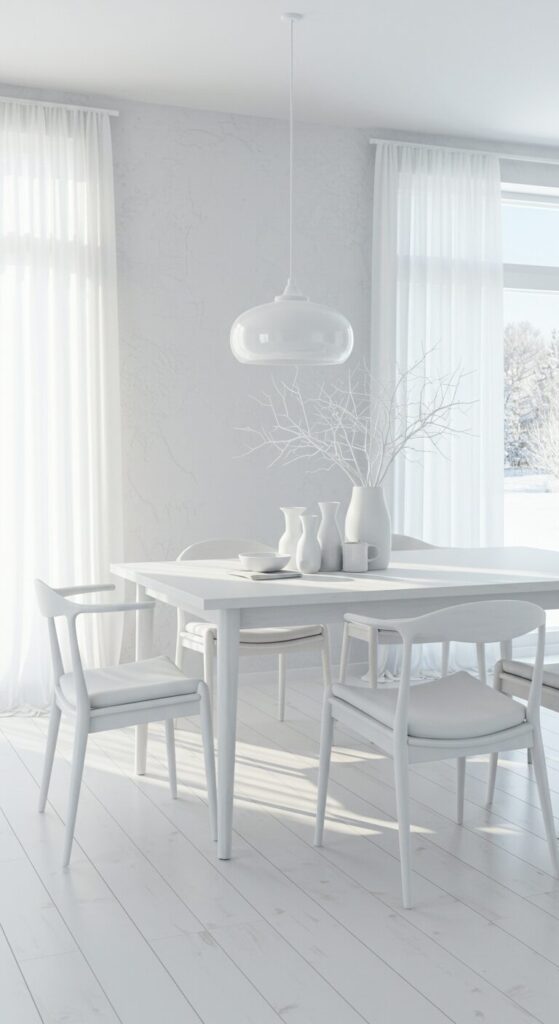 Step into a dining room bathed in crisp whites, where sunlight bounces off snow outside, mirroring the purity of a fresh winter morning.