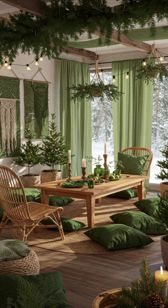 Wander into a dining nook where lush evergreens climb the walls, blending with a woven rug under a bamboo table for ultimate boho ease.