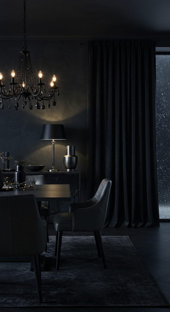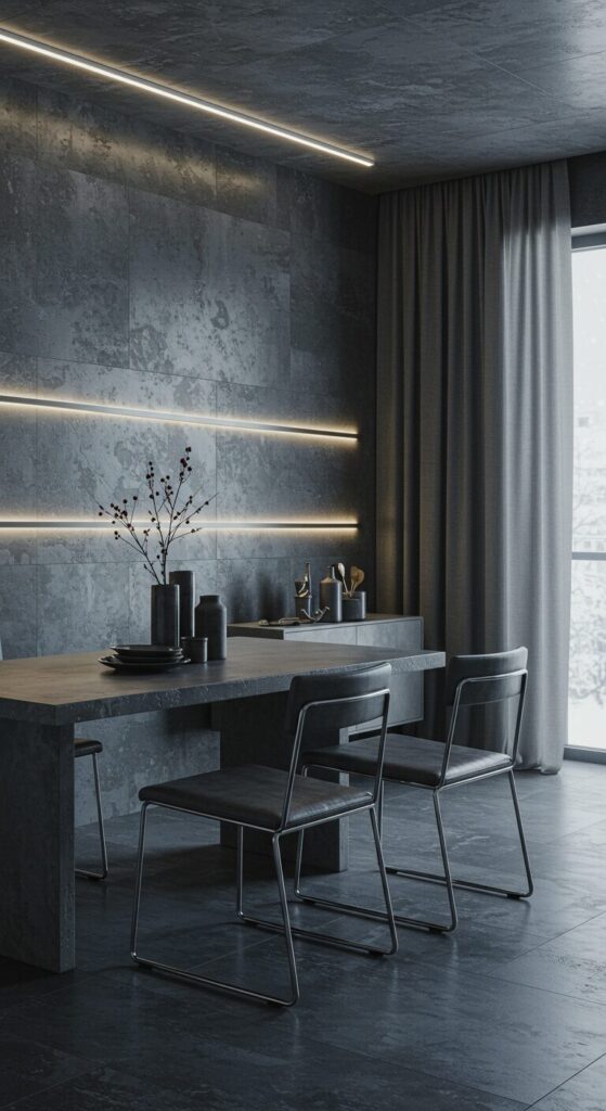 Visualize a dining area where slate gray walls meet a quartz table, offering a sleek canvas against winter’s monochrome palette.