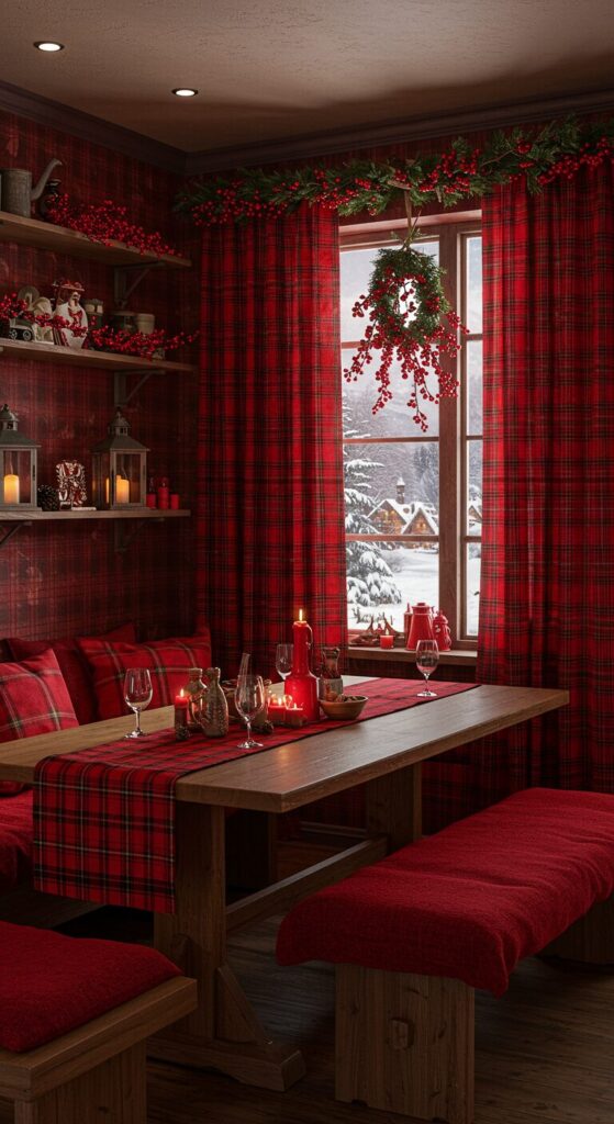 Enter a space alive with crimson plaid walls, where a pine table becomes the heart of holiday cheer amid swirling snow outside.