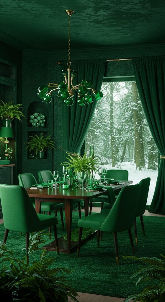 Dream of a room where emerald walls shimmer like hidden gems, centering a jade-toned table for enchanted gatherings.
