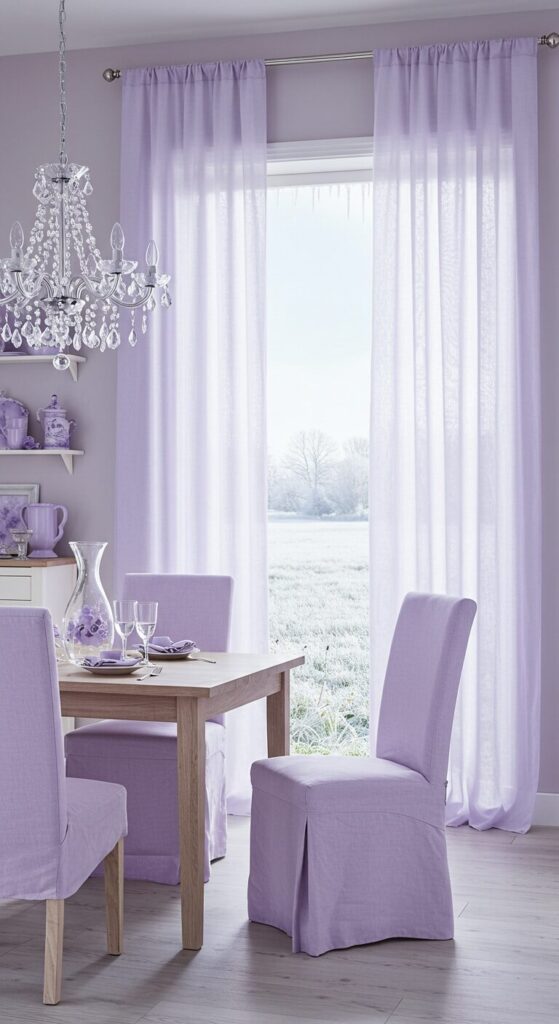 Imagine a dining space where lavender walls whisper of frost-kissed blooms, anchoring a birch table in soft elegance.