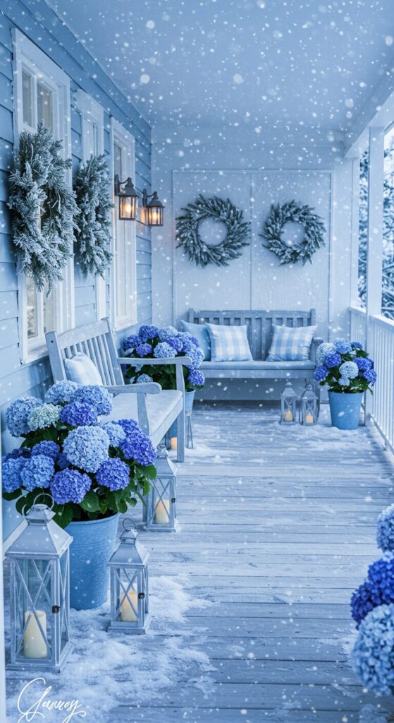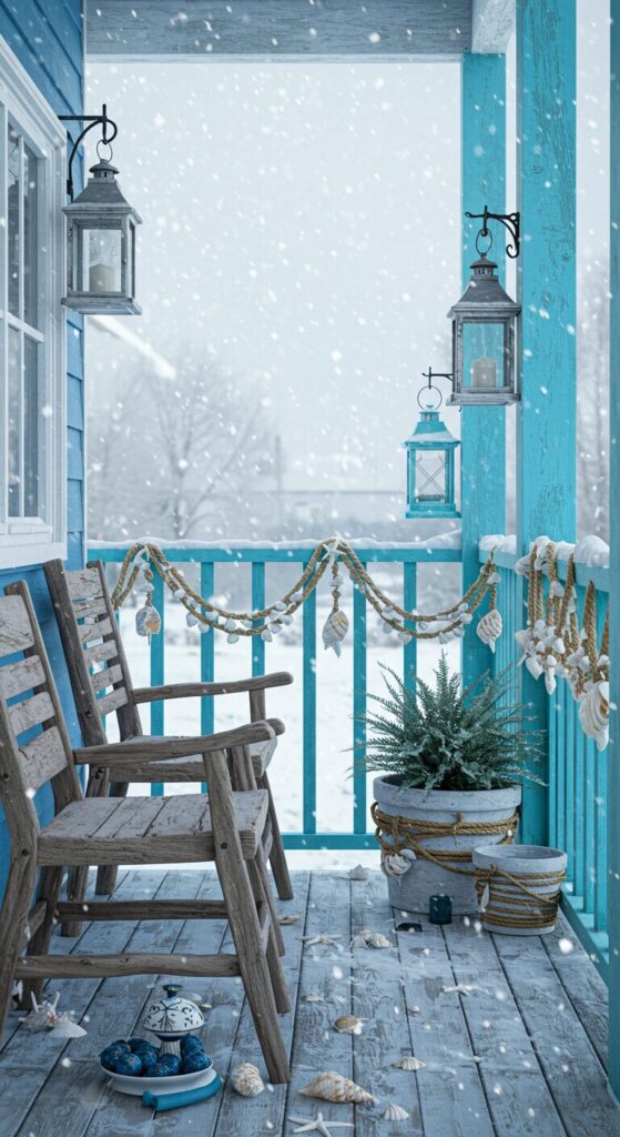 Incorporate faded blue lanterns glowing softly, unifying the theme with serene ocean hues. Your porch becomes a tranquil retreat, even in the snow.