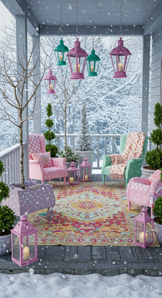 Drape patterned fabrics over loungers, infusing the eclectic theme with cheerful energy. This porch turns winter into a playful adventure.