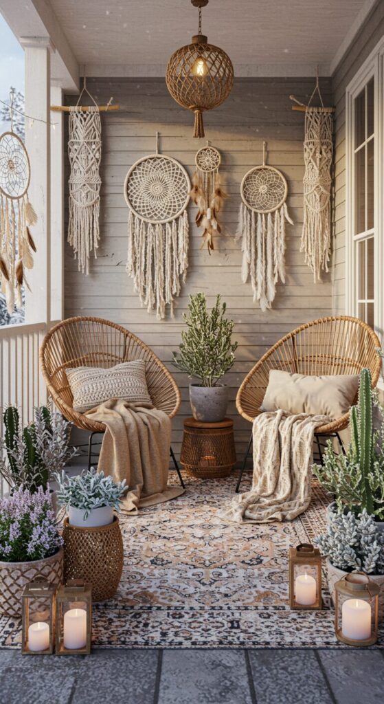 Weave in macramé planters holding dried grasses for a relaxed, eclectic touch amid the cold. Scatter woven baskets with pine accents to blend nature with bohemian flair.