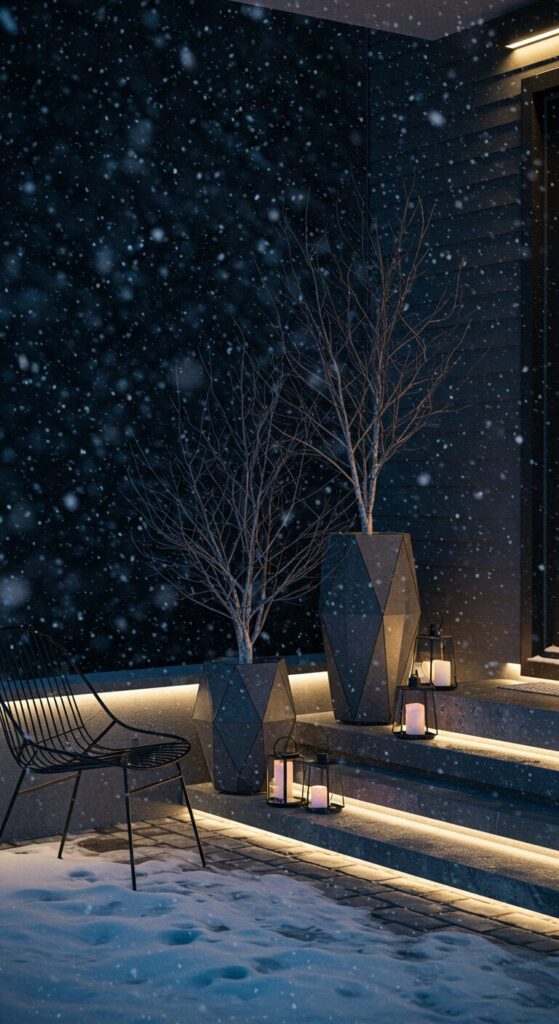 Add subtle lighting strips along railings, enhancing the monochromatic scheme with quiet sophistication. This design offers a fresh take on winter welcoming.