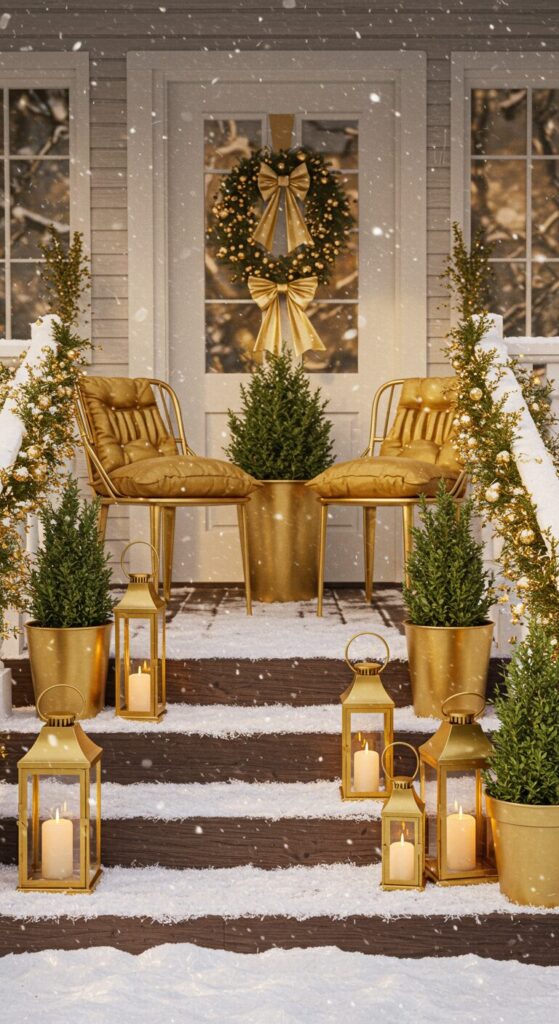 Bundle up your porch with pine branches and wooden crates overflowing with evergreen boughs for that timeless forest feel. Add lanterns flickering softly to cast a golden hue over the snow-kissed steps.