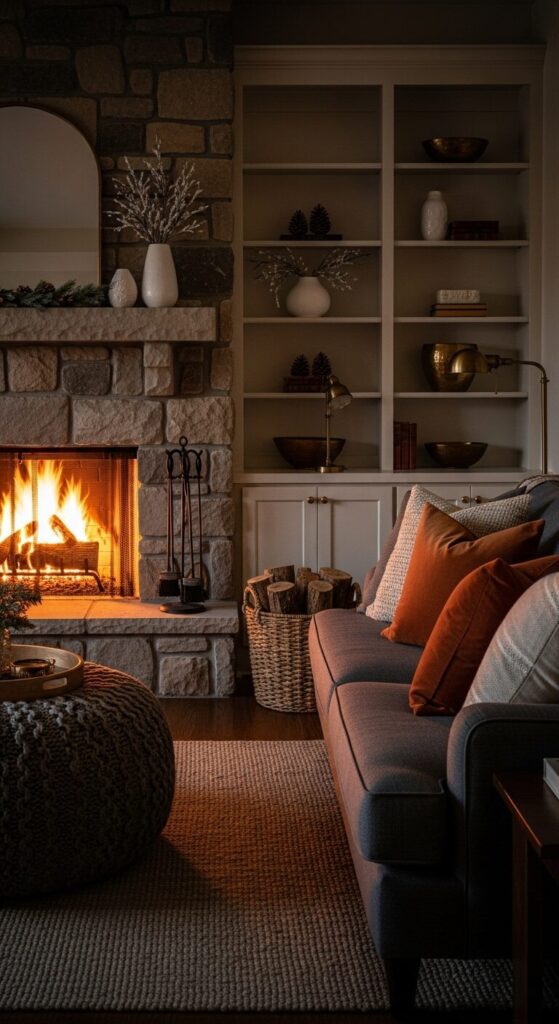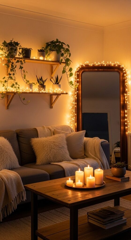 Choose warm-toned LED candles for safety and longevity. Arrange your seating to face this focal point and add warm metallics through accessories to reflect light around the room.