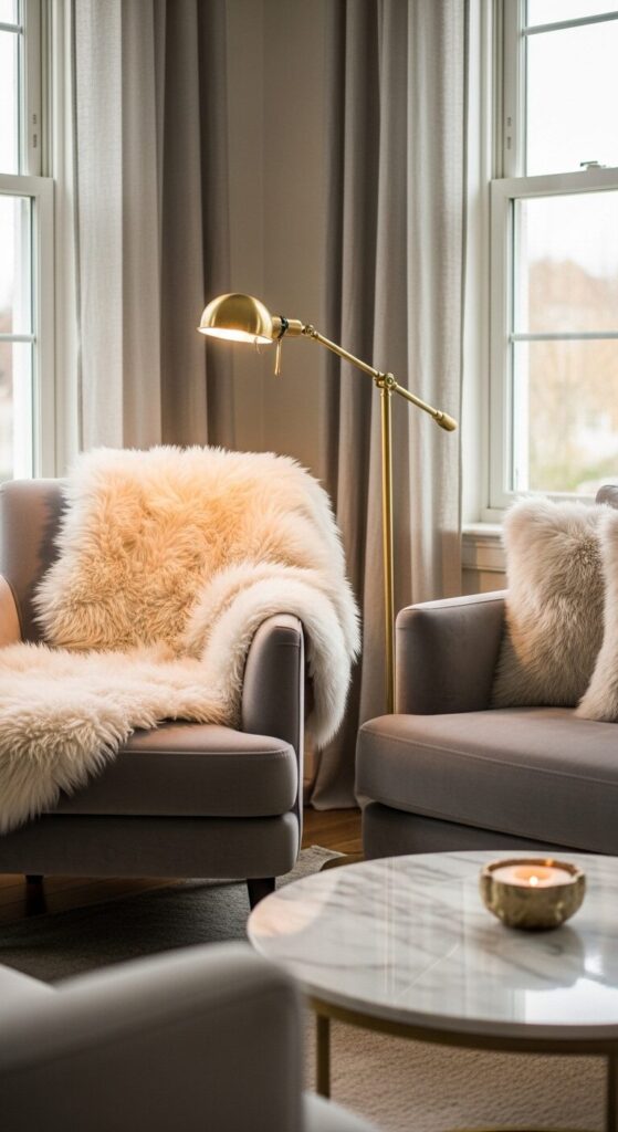 Mix fur textures—short pile with long pile—for dimension. Keep the color story tight with just one or two fur tones so the space feels cohesive rather than chaotic.