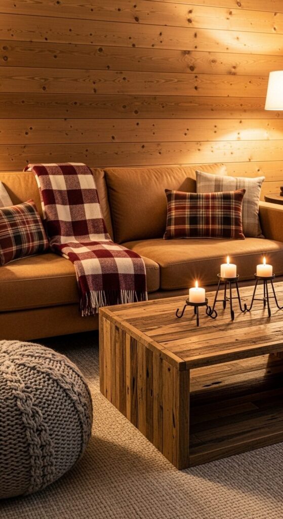 Picture a living room where classic plaid patterns create a cabin-inspired retreat. A burgundy and cream plaid throw blanket folds over the back of a tan leather sofa, while coordinating plaid cushions in different scales add visual rhythm.